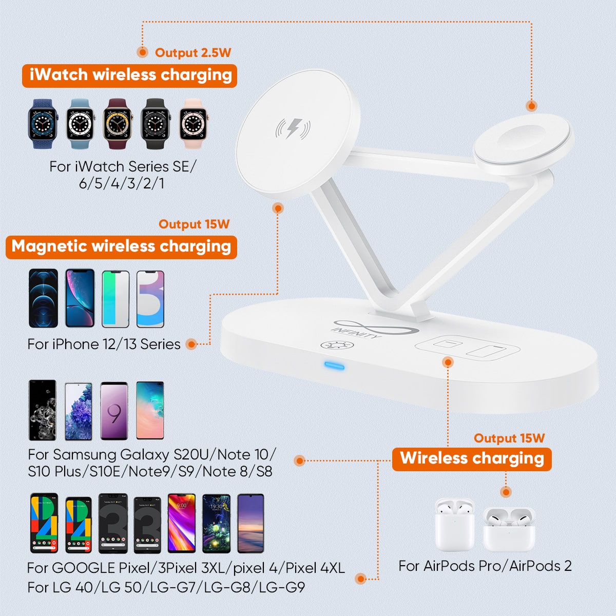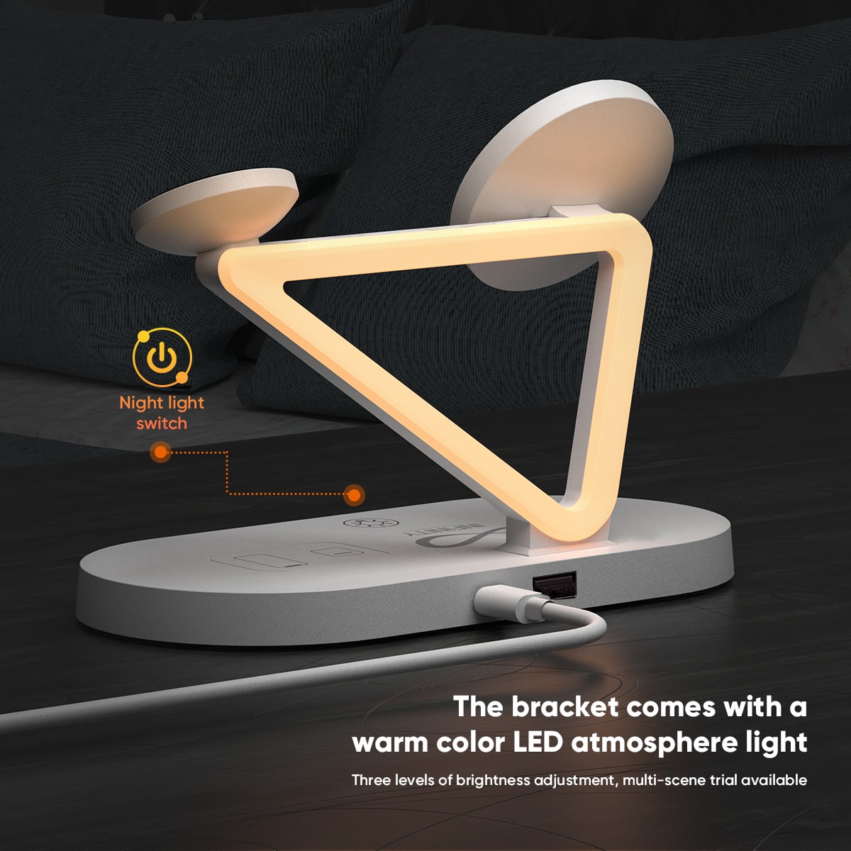 This 5-in-1 Wireless Charging pad comes with a warm color LED atmosphere light. Three levels of brightness adjustment, multi-scene trial available